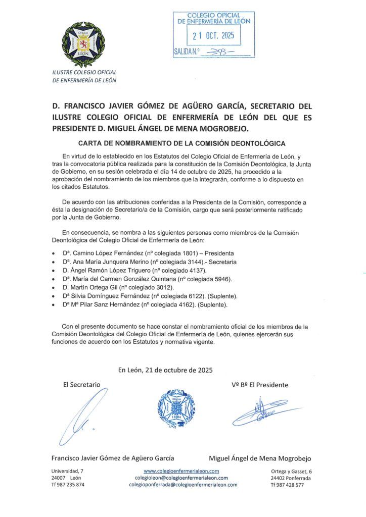 Nueva composición de la Comisión Deontológica del Colegio de Enfermería.